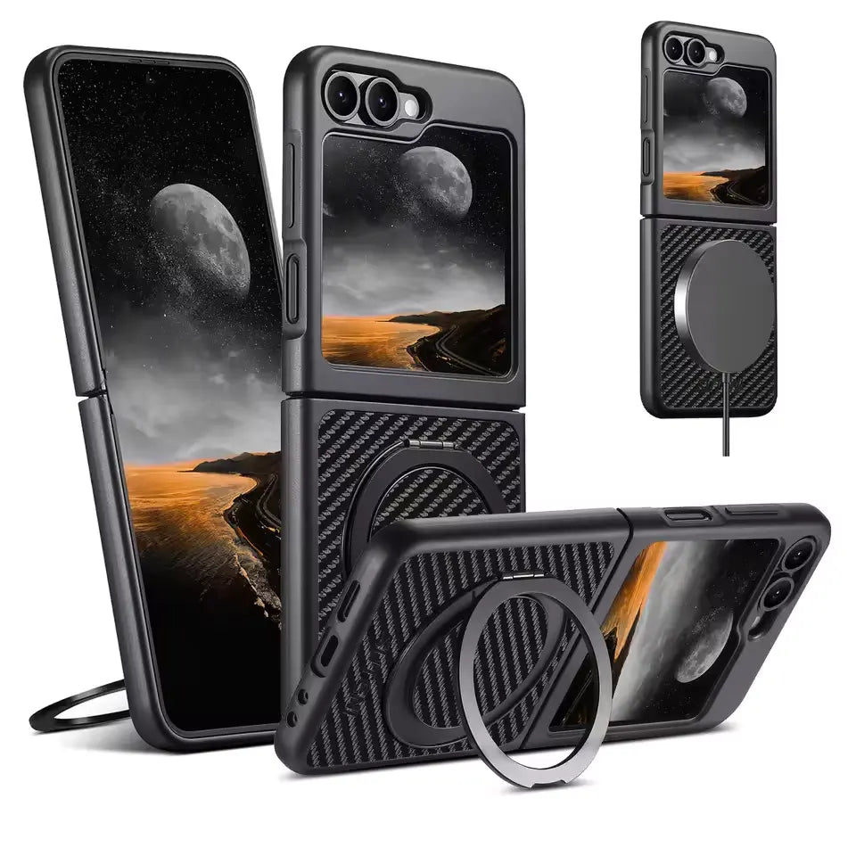 This Z Flip case merges carbon fiber texture, MagSafe compatibility, and a 360° rotating ring stand into a sleek, high-tech design. Built for performance — made for protection.